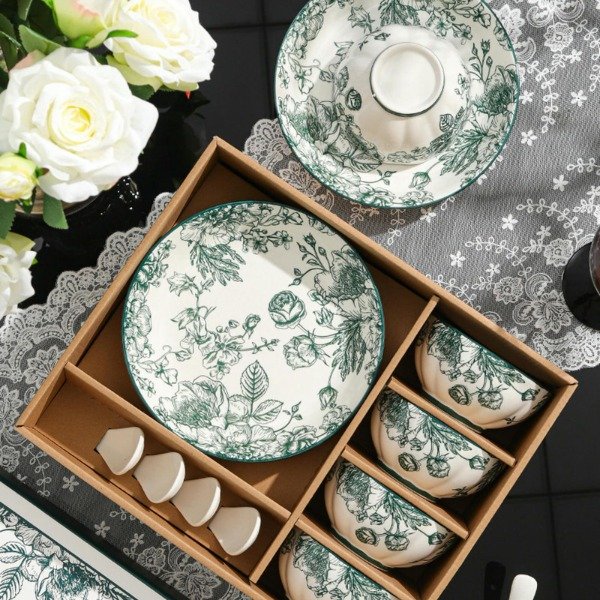SET X4 BOWL Y CUCHARA C/2 PLATO C/DIBUJO DE FLOR LOTO/ROSA